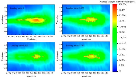 Figure 27 shows the average strength cloud map of the dry powder under different loading ratios. It can be seen from the figure that, under different loading ratios, the diffusion of the dry powder has a “horn” shape, and the effective fire-extinguishing area has a “V” shape. As the dry powder loading ratio increases, the effective fire-extinguishing area gradually increases, and the average dry powder strength in the effective fire-extinguishing area gradually increases. When the dry powder loading ratio is 1, the effective fire-extinguishing area is the largest, and the average dry powder strength in the effective fire-extinguishing area is also significantly higher than for other average dry powder strengths.