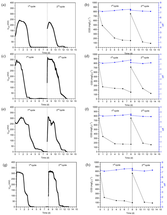For the MFC4, the wastewater from the confectionery industry was used as a substrate and the results are shown in Figure 1g,h. The Ucell was highest in the first and second cycles at 313 mV and 323 mV, while the pH values ranged from 7.22 to 7.82 during both MFC4 operating cycles, as shown in Figure 1h. COD reduction was of 86.8% and 87.9% and εcb was calculated to be 14.1 and 10.1%.