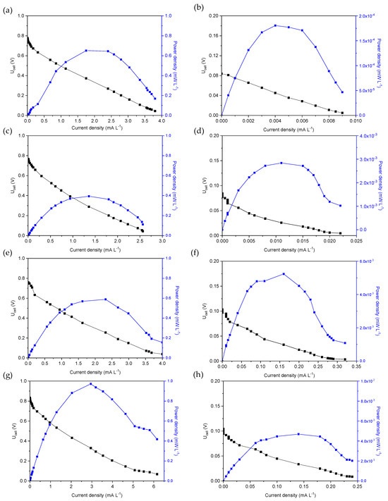 MFC voltage and power density versus current density for (a,b) MFC1, (c,d) MFC2, (e,f) MFC3 and (g,h) MFC4, at the beginning (a,c,e,g) and the end (b,d,f,h) of the first operating cycle.