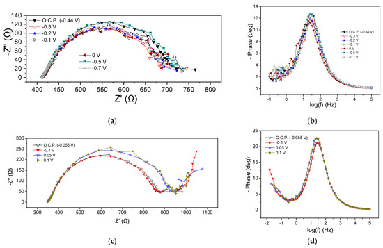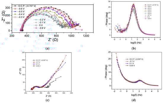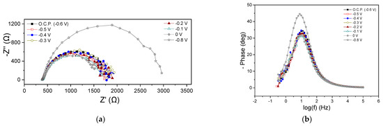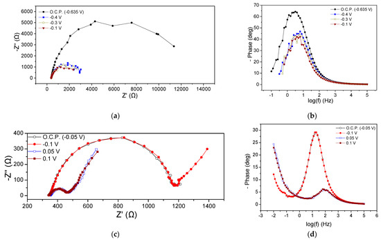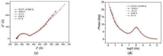 At the end of the cycle, Rohm was found to be 285 Ω under OCP conditions, 0.1 V and 0.05 V, respectively, while it appeared slightly increased (294 Ω) when applying −0.1 V (Figure 6c). The calculated value of Rp was 35, 53, 60, and 62 Ω for OCP, 0.1, 0.5, and −0.1 V, respectively. Warburg-type element behavior was observed as in the previous cases, while there were no significant differences in the Bode plots (Figure 6d).