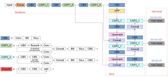 The Neck part is composed of the CSP2_X structure, Feature Pyramid Network (FPN) [], and Path Aggregation Network (PAN) []. In the Neck network, FPN and PAN structures are used to achieve bottom-up and top-down feature fusion, which enhances the feature fusion capability. Three decoupling heads are set at the output end of the network, which is connected to the three outputs of the Neck part, respectively, and the corresponding prediction boundary boxes are generated on the feature graphs with sizes of 20 × 20, 40 × 40, and 80 × 80. This paper adopts a lightweight Yolov5s model for training, and the network structure is shown in Figure 1. In Figure 1, Conv represents a module in the convolutional neural network, BN represents Batch Normalization, SiLU represents the Swish function, CBS represents Conv + BatchNorm + SiLU, and SPPF is an improved version of Spatial Pyramid Pooling, which is used to splice different pooling results.