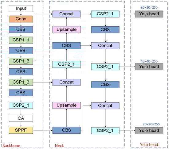 Finally, data such as Loss, results, and mAP are calculated to save the images detected during training and the training model. The specific structure of the improved CA-YOLOv5s algorithm is shown in Figure 8.