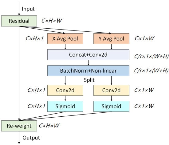Attention mechanisms include squeeze-and-excitation networks [], convolutional block attention module (CBAM) [], ECA-Net [], Coordinate Attention, etc. Coordinate Attention [] mainly encodes channel relationships and long-term dependencies through accurate position information. The model can identify and extract the key information in the image more accurately. Compared with other attention mechanisms, Coordinate Attention not only considers the channel information but also the location information related to the direction and is flexible and lightweight enough to be easily inserted into the core module of the lightweight network, which can improve the precision and accuracy of the model without adding additional computational overhead.