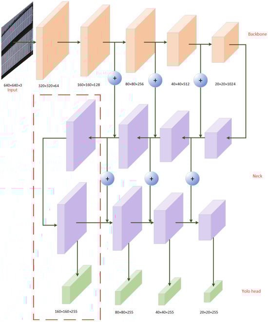 For the photovoltaic module pictures collected by the UAV, the defect size of the bird droppings to be detected is too small, and the background image is large. For a picture of 4000 × 3000 pixels, the pixel of bird droppings is less than 50 × 150, and the shape is irregular, so the detection is difficult. The original YOLOv5s model has only three detection layers. The input images are downsampled 8 times, 16 times, and 32 times, respectively, and the generated prediction scales are used to detect small targets, medium targets, and large targets, respectively. However, due to the large downsampling, it is difficult to learn the feature information of small targets from the deep feature map after multiple downsampling steps. The original prediction layer of three scales has been unable to meet the small target detection in the image, and it is easy to miss the detection phenomenon, which leads to the difficulty of bird droppings-related detection of photovoltaic modules.