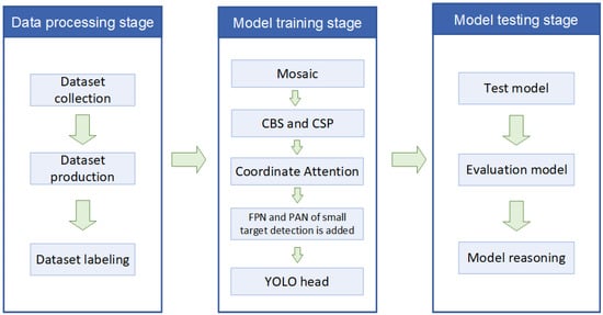 The photovoltaic module defect identification process based on the improved CA-YOLOv5s algorithm mainly consists of the data processing stage, model training stage, and model testing stage, and the overall process is shown in Figure 5.