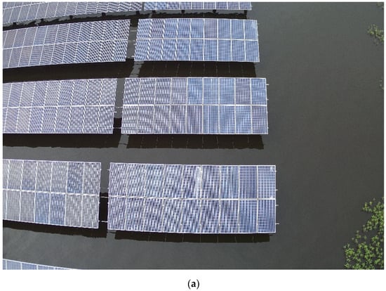 - Data set collection. The appropriate UAV equipment and camera were selected to collect image data from the photovoltaic site, and a total of 457 photovoltaic picture data from different locations and different illuminations were collected. Post-processing of the captured photos, including flipping, rotating, adjusting color, adjusting contrast, and other operations, was carried out to obtain better image effects. The photovoltaic module pictures collected are shown in Figure 6. The main type of surface defect is bird droppings.