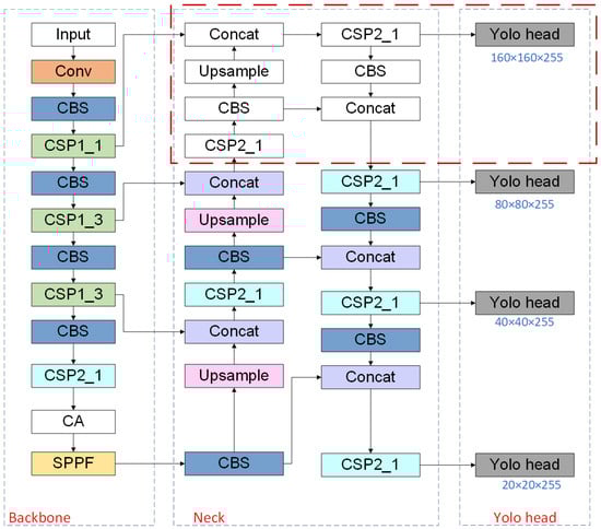 Therefore, this paper proposes to add a small target detection layer to the network structure, from the original three-layer detection layer to the four-layer detection layer. Based on the original network’s three defect prediction scales of 20 × 20, 40 × 40, and 80 × 80, an upsampling layer is added to form a prediction scale of 160 × 160. The newly added prediction layer retains more location information and more detailed features about small targets and has more effective results for detecting small targets. The improved network structure is shown in Figure 4.