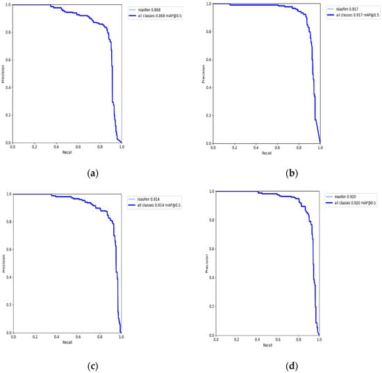 Comparison of mAP values of experiments: (a) mAP result of the YOLOv5s algorithm; (b) mAP result of YOLOv5s+CA; (c) mAP result of YOLOv5s+Detect; (d) mAP result of the CA-YOLOv5s algorithm.