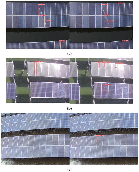 Considering the influence of different lighting environments on the model detection results, this paper tested the photovoltaic module pictures collected under different lighting conditions, including morning light, noon light, and evening light. In the data set, image samples collected in the morning accounted for 71%, and the mAP value of the detection results was 91.7%; at noon, 12% of the samples were collected when the sunlight was strongest, and the mAP value of the detection results was 89.5%; at evening, 18% of the samples were collected, and the mAP value of the detection results was 91.2%. The test results are shown in Figure 11. In Figure 11, the left picture shows the detection results of the unimproved YOLOv5s algorithm, and the right picture shows the detection results of the improved YOLOv5s algorithm in this paper. Through comparison, it can be clearly seen that even under more extreme lighting conditions, such as direct sunlight, the improved algorithm in this paper can still accurately identify the bird droppings-related defect on the photovoltaic module. In the case of insufficient illumination, the improved algorithm can overcome the interference caused by insufficient illumination and still accurately locate the defect location. Under strong light, the algorithm also showed excellent performance and could accurately identify the bird droppings-related defects in the pictures. On the whole, the improved YOLOv5s algorithm in this paper has shown higher accuracy in detecting bird droppings-related defects of photovoltaic modules under different lighting environments, and its performance has been improved compared with the traditional YOLOv5s algorithm. This result provides a reference for the further development and application of photovoltaic module detection technology.