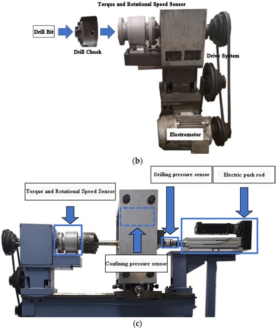 The laboratory rock drilling experiments were conducted using a self-developed miniature MWD system. This system appropriately controls the drilling by adjusting rotation and advancement, and by using sensors, the aim is to extract real-time data of various parameters, including thrust, torque, rotation speed, and drilling speed. When drilling in rock and soil samples, parameters such as drilling speed, bit rotation speed, and drill rod torque and thrust can be controlled. This system allows the implementation of the following four distinct combined control modes: constant drilling speed–constant rotational speed mode; constant drilling speed–constant torque mode; constant thrust–constant rotational speed mode; and constant thrust–constant torque mode. The key components of the laboratory MWD system include a servo-controlled drilling system, a servo-controlled confining pressure system, a drilling parameter acquisition system, and a control system (Figure 1). The main technical parameters of the laboratory MWD system are presented in Table 1. The platform, equipped with torque and rotational speed sensors, drill pressure sensors, confining pressure sensors, and drilling speed sensors, continuously gathers drilling parameters in real time. The details of these sensors are presented in Table 2.