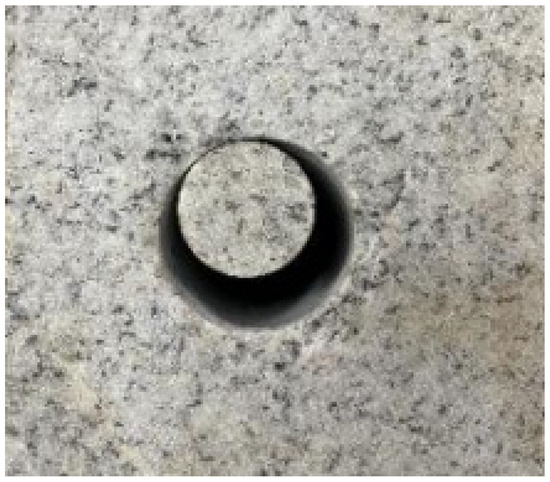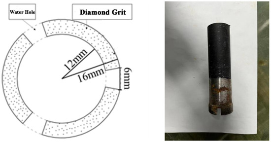 The drilling experiments employed a three-winged, three-nozzle, flat-toothed, impregnated diamond core drill bit, with an outer diameter of 32 mm, an inner diameter of 24 mm, and a nozzle spacing of 6 mm, as demonstrated in Figure 2.