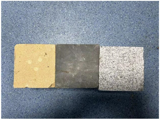 Three types of rock specimens (from left to right: limestone, sandstone, and granite).