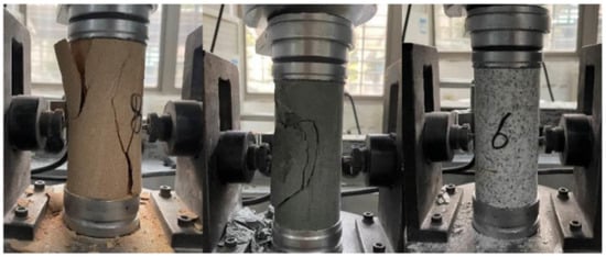 The present study conducted laboratory drilling tests on three types of rock samples: granite, sandstone, and limestone (Figure 3). The samples were cube-shaped with dimensions of 100 mm × 100 mm × 100 mm and had smooth and intact surfaces without visible cracks. Uniaxial compression tests were performed on cylindrical standard samples made from the same batch of rocks using a rock mechanics testing (RMT) machine (Figure 4). For this purpose, the samples were placed in the center of the press platen, and the pressure plate was adjusted with a spherical seat to ensure that the samples were pressed uniformly. The control mode was displacement loading with a loading rate of 0.0020 mm/s until specimen failure. Each test set was repeated at least three times, and the mechanical parameters of the three types of rocks were obtained, as illustrated in Table 3.