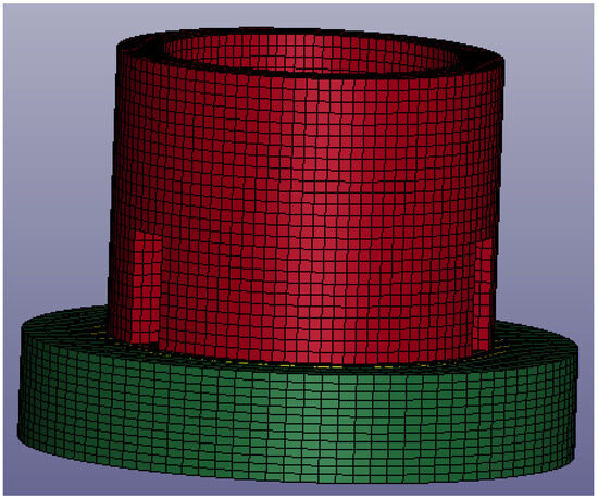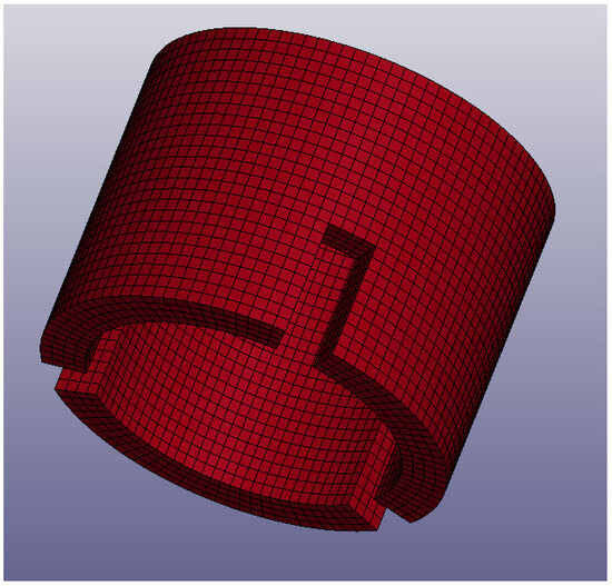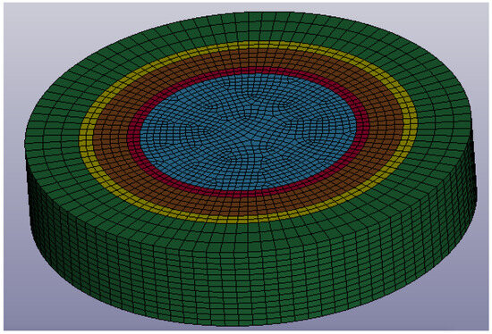 Using LS-Dyna, a rock block was constructed and meshed for dynamic numerical simulation of MWD (Figure 7). To improve the CPU computation time of the dynamic numerical model and reduce the mesh data, the rock block was constructed in a cylindrical shape, with the actual contact area with the drill bit being the brown area, as illustrated in Figure 7. The height and radius of the rock block were, respectively, set as 9 cm and 23 cm.