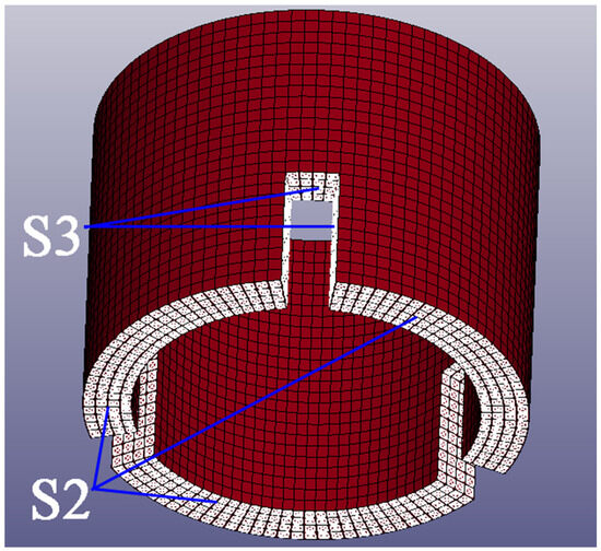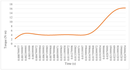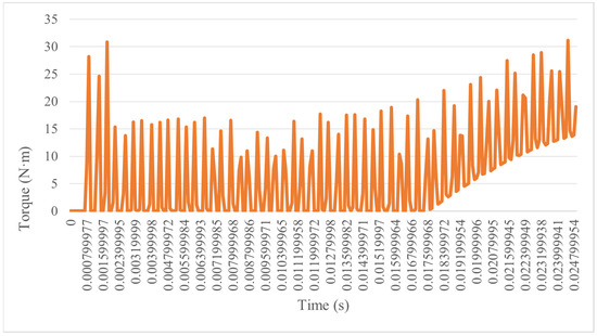Herein, data on the torque, drill bit rotational speed, and drilling speed were obtained during the operation of the drilling rig. The rotational speed and drilling speed were set as fixed preset values for each simulation. The torque was determined by obtaining Z_moment data from the lower S2 and S3 levels of the drill while drilling in the RCFORC (Figure 9). The specific parts represented by S2 and S3 are shown in Figure 10. Subsequently, the sum_curves feature in LS-Dyna PLOT was utilized to combine the Z_moment from both surfaces to obtain the sum of the moments (Figure 11). Then, an SAE filter with a C/S cutoff frequency of 60 Hz was utilized to reduce noise and suppress interference in the data. The resulting torque is illustrated in Figure 12. To ensure the automatic acquisition of actual drilling data for various types of rock and to enhance the quality of training data for the parameter prediction model, the study excluded data from the initial and final stages of the drilling process, capturing only the torque data of each simulation between 0.005 and 0.015 s.