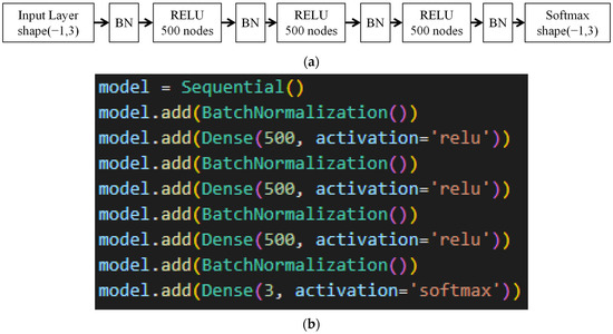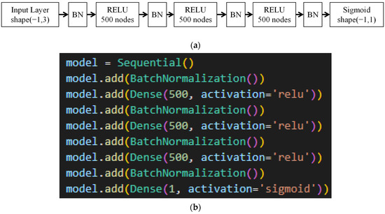 Structure of the neural network model for predicting the rock type in the dynamic numerical simulation: (a) structure diagram, (b) main code.