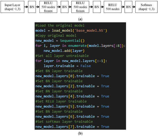 Schematic representation of the layer-by-layer transfer learning model: (a) structure diagram, (b) main code.