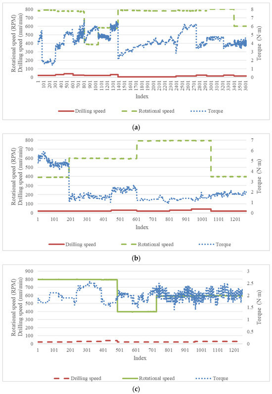 Multiple drilling tests were conducted in constant drilling speed–constant speed mode on three types of rock samples. The basic parameters of the drilling tests are shown in Table 4. The types of rocks used for the drilling tests were the same as those of the compression tests, all of which were obtained from the same batch and location. In each drilling experiment, the drilling depth (D) was continuously set at 100 mm, and the fixed drill rotation speed (N) was set at three different levels: 400, 600, and 800 RPM. For the granite drilling experiments, the constant drilling speed (v) was set at a variable rate from 5 to 40 mm/min, while for limestone and sandstone, the constant drilling speed (v) was set at a variable rate from 20 to 40 mm/min. During drilling, the MWD data were collected at 1 s intervals, and parameters such as torque, actual drilling speed, and actual rotational speed during drilling were recorded.