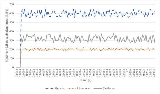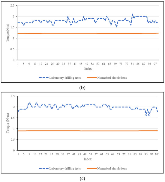 During actual simulation calculations, the drilling depth increases geometrically with simulation time, and when a layer of rock block is removed, the drill bit enters a free travel phase. Because adjusting the drilling speed consumes considerable time, it takes more than 10 h of execution time to complete the drilling a full 9 cm rock block on a computer with a 64-core 4.0 GHz CPU and 512 GB memory. In addition, when the drill reached the next layer of rock, an impact force was generated, which led to anomalies in the drilling data. Therefore, in this study, the drilling time was set to 0.025 s with a data collection interval of 0.0002 s, which is approximately the time required to drill through a simulation layer. With this setup, running a drilling simulation takes just over 2 min.