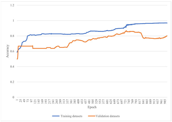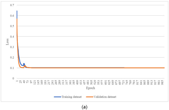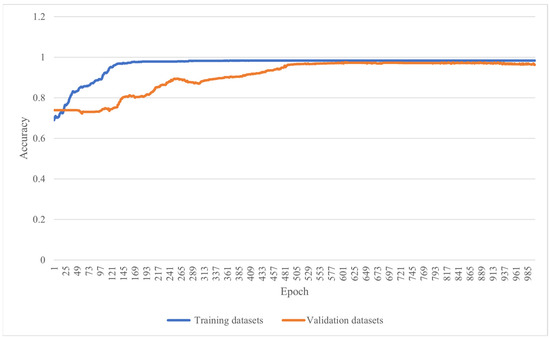 In the rock classification models, the data distribution was maintained at 10% for testing, 10% for validation, and 80% for training. The training and validation datasets were employed to train the model, and the test dataset was implemented to evaluate the classification accuracy of the model. The learning curve of the prediction model, as illustrated in Figure 23, contains 104,940 data inputs, which include the numerical simulation data for all three rock types. The model was trained over 1000 epochs with a batch size of 5000. The learning curve shows a continuous decrease in prediction error as training progresses, indicating correct configuration and effective training of the model. The accuracy curves for both the training and validation datasets of the classification models of the three rock types are perfectly aligned, indicating no overfitting or underfitting. The classification accuracy was achieved as 99.25% for the training set, 99.42% for the validation set, and 99.41% for the test set, demonstrating a high level of prediction accuracy in all the rock types.