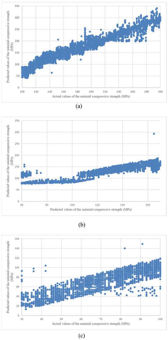Comparison of the uniaxial compressive strength prediction results: (a) granite, (b) limestone, (c) sandstone.
