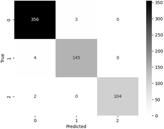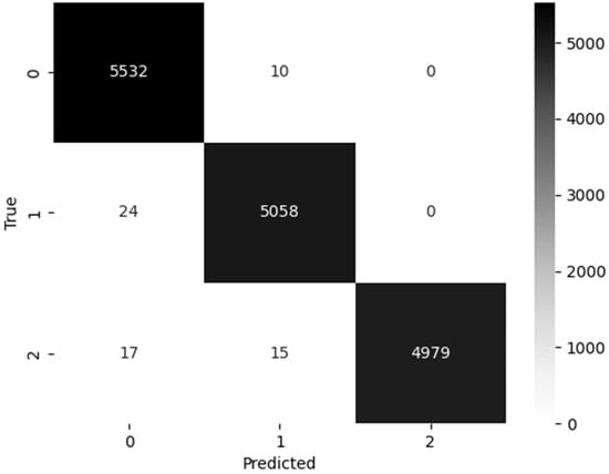 Figure 28 presents the confusion matrix for the test dataset. The obtained results are indicative of the fact that the neural network approach could achieve a prediction accuracy of 99.82% for label 0 (granite), 99.53% for label 1 (sandstone), and 99.36% for label 3 (limestone). Compared to the prediction models without transfer learning, the prediction accuracy of granite is improved by 7.9%, sandstone by 19%, and limestone by 22.94%. These are significant improvements in classification accuracy for all three rock types, demonstrating that the exploitation of transfer learning methods noticeably mitigates the issue of lower prediction accuracy due to insufficient training data for actual drilling parameters.