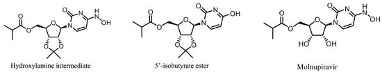 - Hu, T.; Xie, Y.; Zhu, F.; Gong, X.; Liu, Y.; Xue, H.; Aisa, H.A.; Shen, J. “One-Pot” Synthesis of Molnupiravir from Cytidine. Org. Process Res. Dev. 2022, 26, 358–364. [Google Scholar] [CrossRef]
