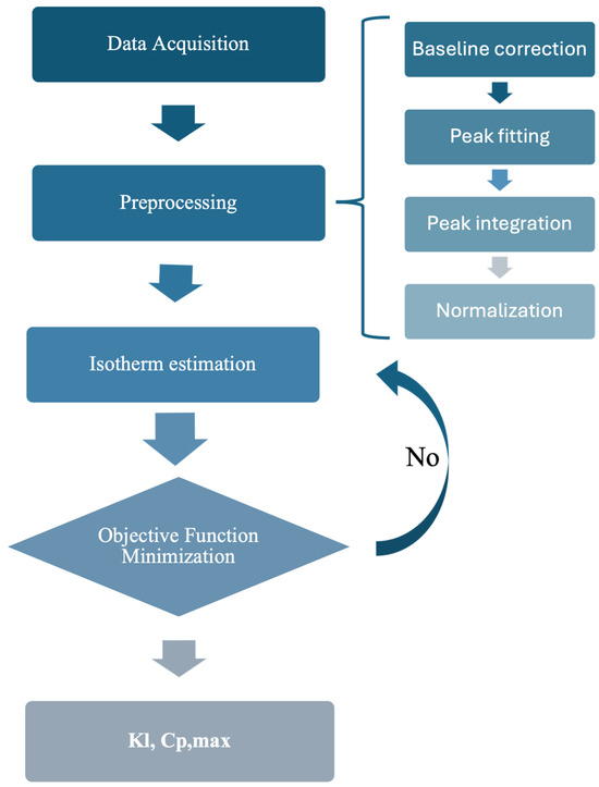 The following methodology in Figure 2 was applied to determine the adsorption isotherm constants. Firstly, raw data were collected by passing single–component solutions of the two products through the stationary phase and detecting the resulting peaks. Secondly, a baseline correction was performed to eliminate any extraneous signals that could compromise the accuracy of peak integration. Next, peak fitting was performed by fitting a suitable model, like Gaussian distribution, to the original data in order to derive the peak shape parameters, including peak height, FWHM, and center. Peak integration was then performed using the peak shape parameters obtained from peak fitting. Normalization was accomplished by dividing the peak area by the respective product’s concentration.