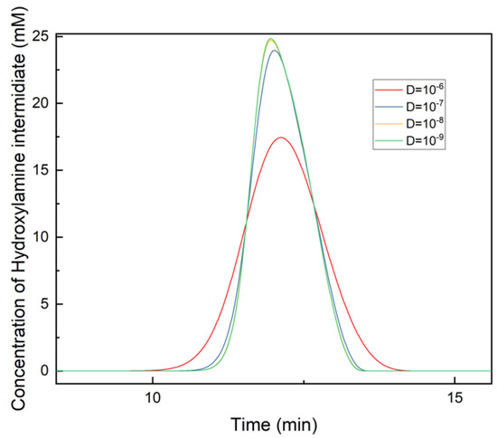 The dispersivity coefficient (D) is a quantitative measure utilized in chromatographic systems to assess the relative effects of hydrodynamic dispersion and molecular diffusion on solute transport within the matrix of the column. The variation in the elution profiles of a 25 mM hydroxylamine intermediate at various values of D is illustrated in Figure 4. With a D value of 10−9, the resulting peak is sharply defined, with a steep rise and fall that indicates a highly efficient chromatographic separation where band broadening is minimal. The observed widening of the peak as D approaches 10−8 and 10−7 indicates an intensification of the interaction between diffusive and dispersive phenomena, resulting in prolonged retention times and improved peak dispersion. At the highest value, when D is equal to 10−6, the peak shows significant widening, with the longest retention time and the smallest relative peak height among the range that was examined. At a dispersivity coefficient of 10−6, the heightened interaction between solute molecules and the stationary phase substantially increases peak tailing, directly affecting the separation’s selectivity and analytical resolution. This condition emphasizes the importance of fine–tuning the dispersivity coefficient to maintain the balance between peak efficiency and resolution, which is essential for achieving the stringent purification standards required for the production of high–purity hydroxylamine intermediates in molnupiravir synthesis.