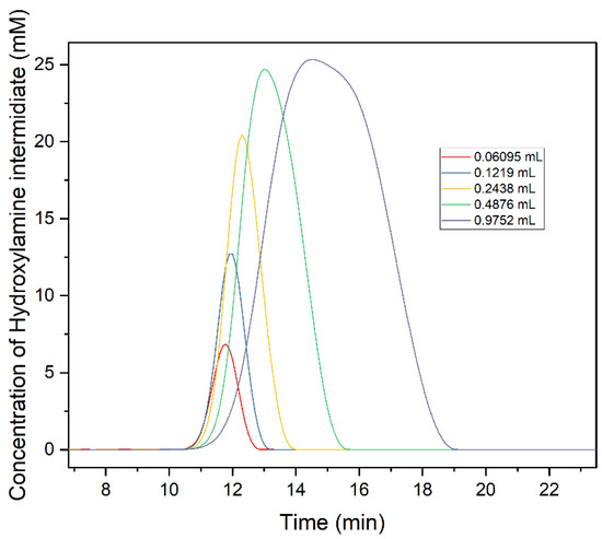 In the optimization of chromatographic methods, the injection volume plays a pivotal role, as demonstrated in the chromatograms of a 25 mM hydroxylamine intermediate depicted in Figure 5. With an increase in the injection volume from 0.06095 mL to 0.9752 mL, a trend is observed where larger volumes lead to an elongation of retention times and an expansion of peak widths. This expansion indicates a more pronounced engagement of the solute with the stationary phase, a consequence of providing a greater quantity of the sample for adsorption–desorption processes within the column. The smallest volume, 0.06095 mL, is associated with the narrowest peak, suggesting that the solute band is tightly constrained with minimal longitudinal and transverse diffusion. As the volume increase, the peak broadens due to enhanced longitudinal diffusion, and the retention time extends, attributable to the increased mass of solute interacting with the stationary phase. The largest volume, 0.9752 mL, presents the most extended elution profile, which signifies a heightened solute–stationary phase interaction time and a greater degree of band spreading. These phenomena collectively underscore the sensitivity of the chromatographic system to injection volumes, emphasizing that precise control over this parameter is essential for maintaining the desired selectivity and resolution within the chromatographic separation. This sensitivity is well documented in the literature, with studies by Ren et al. (2013) and Boonen et al. (2013) highlighting the critical role of injection volume in chromatographic performance [34,35]. Our findings further confirm the necessity of precise injection volume control for achieving optimal chromatographic outcomes.