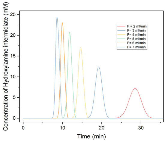 The inlet flowrate is a pivotal parameter in chromatographic separations, as it directly influences the interaction between the analyte and the stationary phase, as well as the transit time of the analyte through the column. Figure 6 provides a detailed examination of how varying the flowrate impacts the elution profile of a 25 mM hydroxylamine intermediate. At the lower end of the studied range, a flowrate of 2 mL/min results in a pronounced retention time and notable peak broadening, signifying a more extensive engagement between the analyte and the stationary phase. This can be attributed to the slower passage of the mobile phase, which allows for increased solute diffusion both longitudinally along the column and transversely across the column’s width, resulting in a heightened probability of solute interaction with the stationary phase and consequent band spreading. As the flowrate escalates to 7 mL/min, a decrement in both peak width and height is observable, which reflects a reduction in the analyte’s retention time and a contraction in band spreading. At this elevated flowrate, the analyte’s residence time within the column is significantly reduced, diminishing the opportunity for diffusive spread and resulting in a more efficient elution profile. However, the acceleration of the mobile phase may also curtail the solute–stationary phase interactions essential for achieving optimal resolution. The intricate interplay between flowrate and chromatographic output is exemplified by the transition from broad, dilated peaks at low flowrates to constrained, attenuated peaks at higher flowrates. These observations substantiate the necessity of meticulously balancing flowrate to optimize chromatographic resolution and throughput.