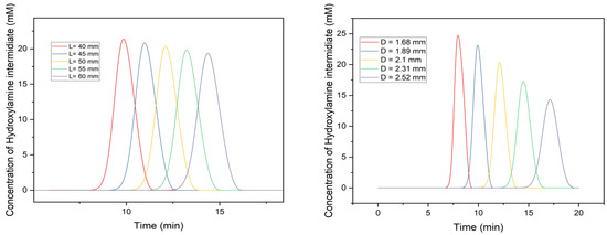 The length and diameter of the column play crucial roles in chromatographic separation performance. A longer column length provides a greater surface area for interaction between the analyte and stationary phase, thereby enhancing separation efficiency. However, shorter columns are more susceptible to band broadening due to factors such as longitudinal diffusion and extra–column effects. A larger diameter column will have a larger cross–sectional area, which can result in a slower linear velocity of the mobile phase. Consequently, this can impact the flow of the solute through the column. For instance, hydroxylamine may have a longer retention time in a column with a larger diameter if it interacts more with the stationary phase. In contrast, a column with a smaller diameter will have a smaller cross–sectional area, resulting in a greater linear velocity and a shorter retention time. However, a diameter that is too small can result in high pressure drops, which may cause column damage or a reduction in separation efficiency. According to Figure 7, a 10% to 20% change in column length did not significantly affect the peak height when the column length varied from 40 to 60 mm, while it mainly affected the retention time. On the other hand, the change in column diameter from 1.68 mm to 2.52 mm had a greater impact on the height of the peak. This result may indicate that the diameter of the column has a greater effect on separation performance than column length.