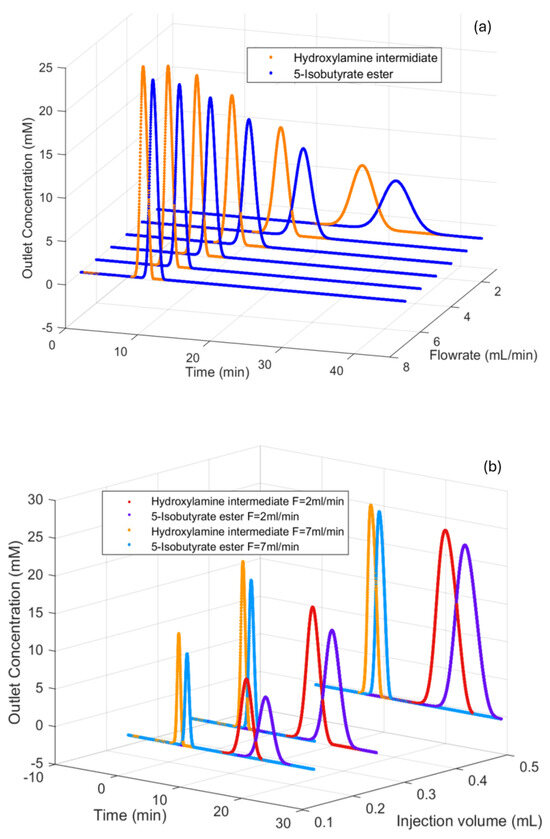 Impact of Flowrate and Injection Volume on Outlet Concentration: (a) Outlet concentration profiles at varying flowrates, (b) Outlet concentration profiles at varying injection volumes and flowrates.