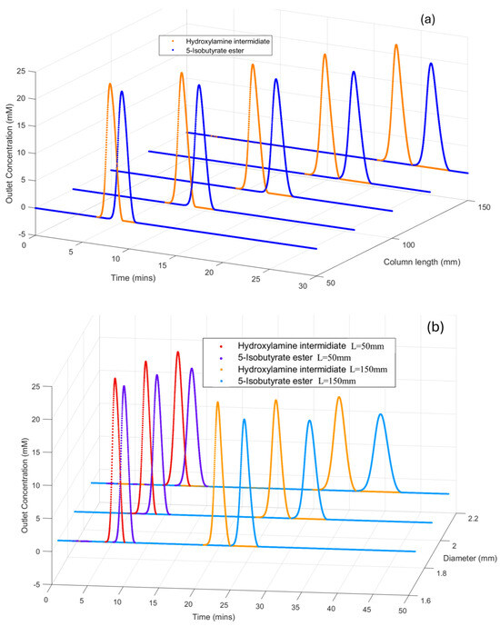 Impact of Column Geometry on Outlet Concentration: (a) Variation with column length. (b) Variation with column diameter for lengths of 50 mm and 150 mm.