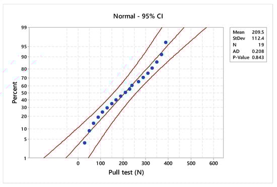 The pull test results and material thickness were statistically analyzed with a 95% confidence interval (CI) and significance level of α = 0.05. The homogeneity of the experimental data was tested by assessing the goodness of fit with a probability plot (Figure 4 and Figure 5). Additionally, the quantitative assessment was performed with a hypothesis test, such as the Anderson–Darling normality test.