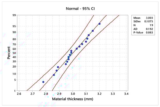 In the case of the material thickness, the mean is 3.003 (95% confidence intervals of 2.951 and 3.054), the standard deviation is 0.107 (95% confidence intervals of 0.081 and 0.159), and the median is 2.99 (95% confidence intervals of 2.958 and 3.074). Moreover, it can be underlined that the estimated value of the Anderson–Darling statistic is 0.192.