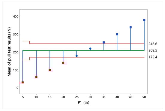 In the case of first level of the laser power (P1), the pull test results indicate that the lower delimitation limit is 172.4 N and the upper limit is 246.7 N, with a mean of 209.5 N (Figure 6) and standard deviation of 74.2 N. Tested parts that had recorded values below the lower limit value were declared scrap.