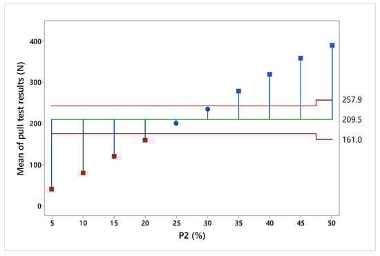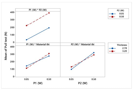 The interaction plot indicates that the material with the highest thickness depends on the P1 laser power, while the material with the lowest thickness depends on the P2 laser power. The difference between the P1 and P2 powers is given by the number of pulses. Specifically, a laser power fraction of 5–25% from the nominal laser power has a negative influence on the results of the pull test, while, for a laser power greater than 25%, the tested parts in the pull test are compliant.