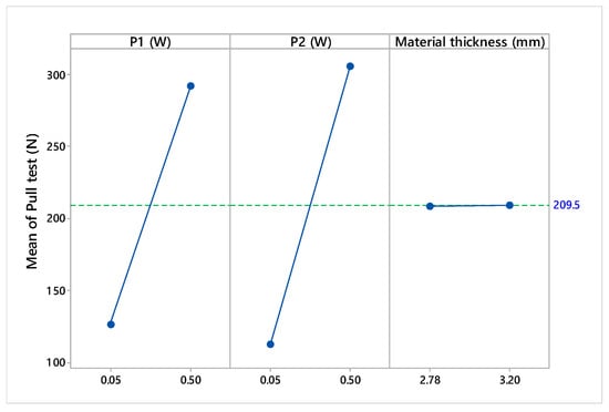 In conjunction with an analysis of variance and design of experiments, we examined the differences among the level means for the three analyzed factors. The P1 and P2 laser powers appear to affect the pull test results compared to an overall mean of 209.5 N. A main effect is present because the different levels of the studied laser powers factors affect the response differently. Additionally, the graph for the material thickness shows that there is no main effect present.