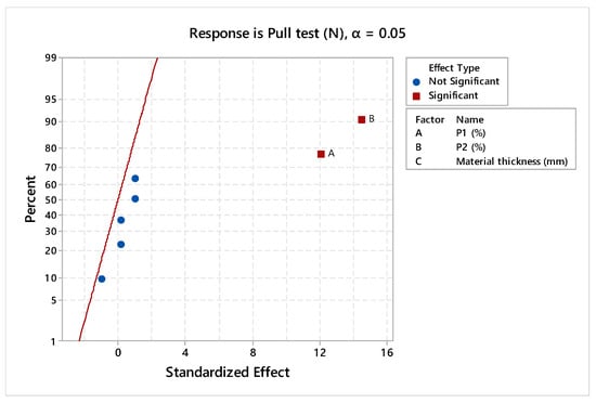 In order to highlight the interaction between the pull test results, laser power and material thickness and its effect on the micro-perforation process, a factorial analysis was designed (Figure 8 and Figure 9). The magnitude and the importance of the effects were determined by applying the Pareto chart of the effects (Figure 10).