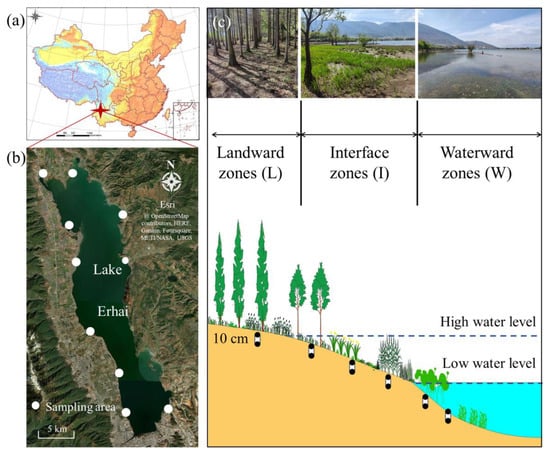 Schematic illustration of the sampling site’s location and distribution. (a) The location of Lake Erhai in China. (b) The location of the sampling area around Lake Erhai. (c) The vertical distribution of the sampling sites on the lakeshore. The photographs show the typical sampling sites in various zones with certain plant types.