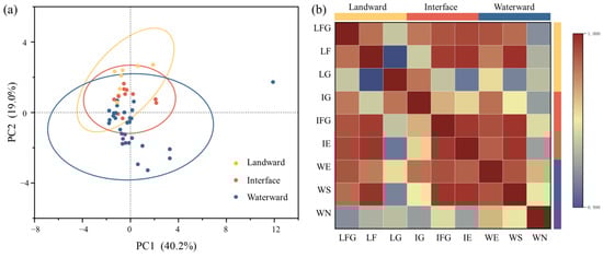 The principal component analysis (PCA) (Figure 2a) showed a clear separation between the landward and waterward sites, with the samples in the interface sites falling in the transition area from landward to waterward. The sample correlation distance heatmap results (Figure 2b) further indicated that the inter-forest grassland (IFG) and emergent plant (IE) in the interface area have more similar environmental characteristics to the vegetation belt in the waterward area (WS and WE), while the terrestrial inter-forest grassland (LFG) and forest land (LF) have more similar environmental characteristics. Furthermore, the areas without plants (WN) differed significantly from those with vegetation cover.