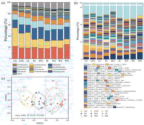 As shown in Figure 4b, the dominant environmental factors in various plant types affecting the microbial communities varied. The microbial communities in the forest soil (LF and IF) were highly related to SOM and TN (r > 0.94, p < 0.05), while those in the grassland soil (LG and IG) were correlated with NH4+-N (r = 0.39, p < 0.05). The microbial communities in the emergent plant zone sediment (IE and WE) were significantly influenced by NO2−-N, TN, and SOM (0.25 < r < 0.48, p < 0.01), and those in the submerged plant zone sediment (WS) were significantly influenced by C/N and WC (0.22 < r < 0.24, p < 0.01). The microbial communities in the no plant zone sediment were significantly related to NO2−-N and NO3−-N (0.34 < r < 0.47, p < 0.01).