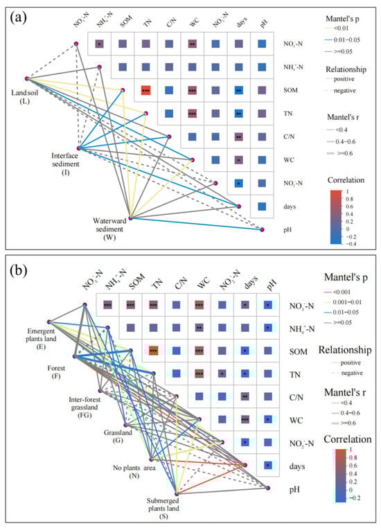 The mantel correlation analysis was used to identify differences in the microbial communities (at the OUT level) and environmental variables (NH4+-N, NO3−-N, NO2−-N, TN, SOM, C/N, pH, WC, and flooding days) under various water levels and vegetation covers as shown in Figure 4. As shown in Figure 4a, all the microbial communities under different water levels were found to be related to SOM and TN (r > 0.22, p < 0.05). Additionally, the microbial communities in the land soil were also correlated to WC (r = 0.28, p < 0.05), while those in the interface sediment were related to C/N and flooding days (r > 0.25, p < 0.05), and those in the waterward sediment were associated with WC and pH (r > 0.16, p < 0.05).