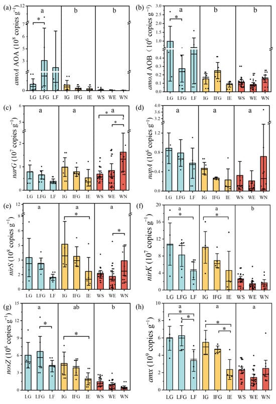 Variations in the abundance of functional genes in the soil/sediment samples. (a) amoA AOA; (b) amoA AOB; (c) narG; (d) napA; (e) nirS; (f) nirK; (g) nosZ; (h) amx. The dots represent the data values for each sample. Different letters indicate significant differences between the samples in different groups (p < 0.05) and the single asterisk (*) indicates that between the different groups (p < 0.05).