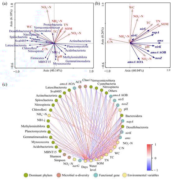 To elucidate the response of the microbial community and functional genes to environmental factors under various water levels and plant covers, RDA was performed to identify correlations between the environmental variables (NH4+-N, NO3−-N, NO2−-N, TN, TC, SOM, C/N, pH, and WC) and the microbial community and functional genes (Figure 6). The results indicated that SOM (18.5%, F = 15.4, p < 0.01) and WC (16.4%, F = 10.8, p < 0.01) were the primary environmental factors influencing the microbial community at the phylum level (Figure 6a), followed by NO2−-N (4.1%, F = 3.8, p < 0.01) and NO3−-N (4.1%, F = 3.6, p < 0.05). For the functional genes as shown in Figure 6b, SOM (36.5%, F = 31.6, p < 0.01) and TC (13.8%, F = 15.0, p < 0.01) were the two dominant environmental factors. Spearman’s correlation coefficients (Figure S5) further revealed that flooding duration differentiated the land soil, interface sediment, and waterward sediment, with most phyla and functional genes showing significant correlations with flooding days. Specific correlations were identified between the environmental factors and microbial communities and functional genes. Actinobacteriota was negatively related to WC and C/N but positively related to NO2−-N (p < 0.05), while Chloroflexi displayed the opposite trend. Additionally, phyla such as Desulfobacterota, Bacteroidota, Verrucomicrobiota, and Cyanobacteria were negatively correlated with SOM and TN (p < 0.05), whereas Desulfobacterota, Nitrospirota, and Nitrospinota were positively influenced by WC and C/N (p < 0.05). Moreover, nitrogen cycling-related functional genes were positively correlated with SOM, TC, and TN but negatively related to C/N (p < 0.05). The amoA AOA and nosZ genes were negatively correlated with WC (p < 0.05), while napA was positively correlated. The gene narG showed positive correlations with NH4+-N and NO3−-N (p < 0.05), whereas napA was positively influenced by NO2−-N (p < 0.05). Additionally, the amoA AOB and nirK were more correlated with pH.