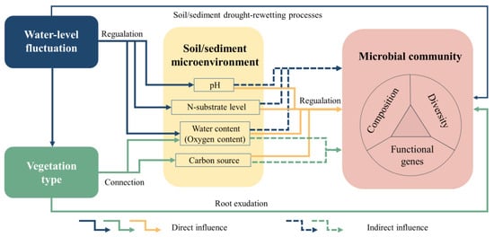 Based on the above-mentioned results, Figure 7 illustrates the potential mechanisms driving the effects of water level fluctuations and vegetation types on microbial communities. Water level fluctuations frequently result in a typical drought–rewetting soil and sediment environment, directly filtering adaptive microorganisms. Furthermore, hydrological fluctuations in the lake littoral zone regulate the physicochemical properties of soil and sediment, indirectly influencing microbial composition mainly through WC, nitrogen substrate levels, and pH values. It is noteworthy that WC is closely related to oxygen content in soil and sediments, making water level fluctuations a key determinant of environmental oxygen content. This multifaceted impact of water level fluctuations contributes to the composition of dominant microbial genera and the abundance of functional genes in the lake littoral zone. Vegetation, a vital participant in the nitrogen cycle of the lake littoral zone, directly affects microbial composition and activity through root exudation [27]. The physicochemical factors vary in vegetation-covered soil and sediments, and litterfall from lake littoral vegetation provides exogenous organic substances, further enriching microbial species and functional genera abundances. The vegetation types in this study represent the lakeshore landscape with plant species combinations, exhibiting a vertical landscape patch and pattern along the hydrological gradient [7]. In conclusion, water level fluctuations and vegetation types jointly affect microbial community structure and nitrogen-related functional genes. This study proposes a simplified topological relationship network to highlight key influencing factors and core pathways affecting microbial community structure and functional gene abundances in the lake littoral zone, providing a possible scientific explanation for the impact of water level fluctuations on nitrogen removal capacity in littoral zones.