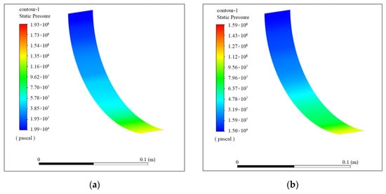 Fluid pressure distribution at different printing speeds. (a) n = 120 m/min; (b) n = 200 m/min.