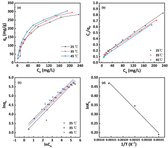 | T (°C) | Langmuir Isotherm Constants | Freundlich Isotherm Constants | |||||
