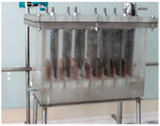 Electrodeposition was carried out according to a previously described method [9] under the following conditions: a temperature of 50 °C, a Dk of 50 mA/cm2, and a rotation speed of the gallinated cathode of 2.0 m/s. An electrolyzer with a rotating gallinated surface was used for electrodeposition (Figure 3).